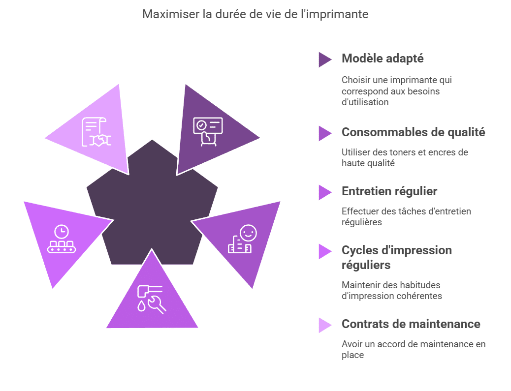 - Choisir un modèle adapté à vos besoins : Un usage intensif avec une imprimante de faible capacité entraînera une usure prématurée.